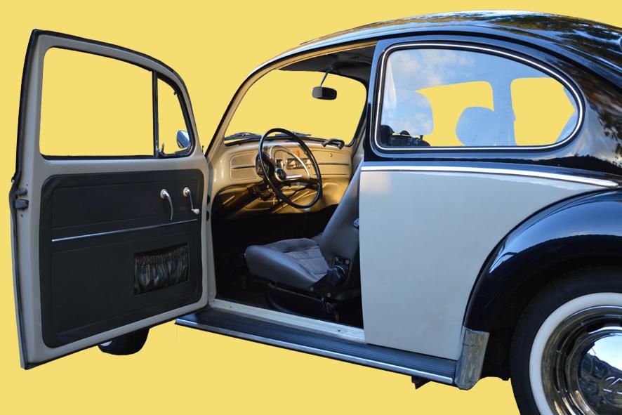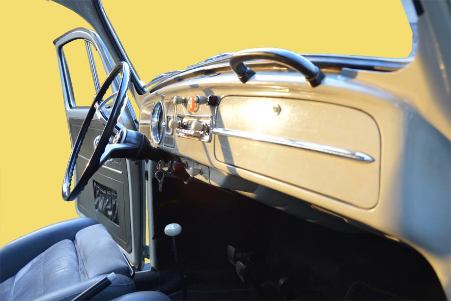 Auch unser Käfer ist 100 % originalgetreu, …bis auf das im Handschuhfach versteckte moderne Autoradio und die bequemen Recaro Vordersitze.